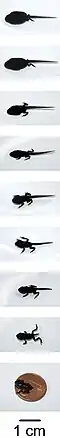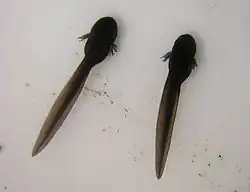 Tadpoles vary greatly in size, both during their development and between species. For example, in a single family, Megophryidae, length of late-stage tadpoles varies between 3.3 centimetres (1.3 in) and 10.6 centimetres (4.2 in).[6] The tadpoles of the paradoxical frog (Pseudis paradoxa) can reach up to 27 centimetres (11 in),[7] the longest of any frog,[8] before shrinking to a mere snout-to-vent length of 3.4–7.6 cm (1.3–3.0 in).