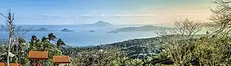 The ridge, which overlooks Taal Lake in Batangas province, is the edge of Taal Caldera. The 25-by-30-kilometer (16 mi × 19 mi) wide cavity is partially filled by Taal Lake.[15] Tagaytay's built-up areas including the urban center are situated in the relatively level top of the caldera rim, but beyond the edge are deep ravines that drop steeply to Taal Lake. The portions adjoining the municipalities of Mendez, Indang, Amadeo, Silang, and Alfonso are level to nearly level areas interspersed with very gently sloping surfaces. Across the southern edge of the lake on the opposite side of the city is Mount Macolod, the highest point of the Taal Caldera rim.