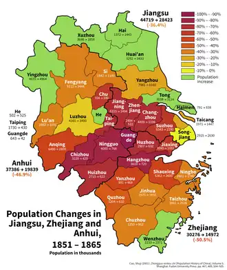 With no reliable census at the time, estimates of the death toll of the Taiping Rebellion are speculative. The most widely cited sources estimate the total number of deaths during the almost 14 years of the rebellion to be approximately 20 to 30 million civilians and soldiers.[61] Most of the deaths were attributed to plague and famine. Some analysts have claimed that the death toll may have reached 100 million.[62][63]