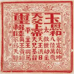 In 1843, Hong failed the imperial examinations for the fourth and final time.[31] It was only then, prompted by a visit by his cousin, that Hong took time to carefully examine Christian pamphlets he had received from a Protestant Christian missionary several years earlier.[32][33] After reading these pamphlets, Hong came to believe that they had given him the key to interpreting his visions: his celestial father was God the Father, the elder brother that he had seen was Jesus Christ, and he had been directed to rid the world of demons, including the corrupt Qing government and Confucian teachings.[33][34][32]