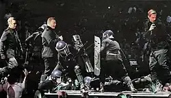 Take That performing on stage at the 2011 Brit Awards with dancers in police-style riot gear