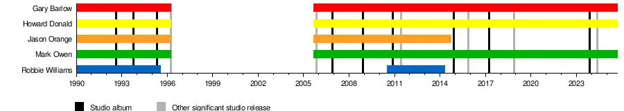 Take That are an English pop group formed in Manchester in 1990. The group currently consists of Gary Barlow, Howard Donald and Mark Owen. The original line-up also featured Jason Orange and Robbie Williams.[2] Barlow is the group's lead singer and primary songwriter, with Owen and Williams initially providing backing vocals, and Donald and Orange serving primarily as dancers.[3][4][5]