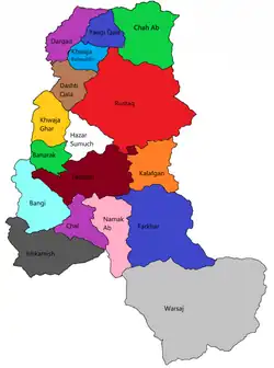 | Ishkamish | _ | 66,695 | 948 | 70 | 103 villages. 40% Tajik, 30% Uzbek, 20% Pashtun, 10% Gujar.[18] |