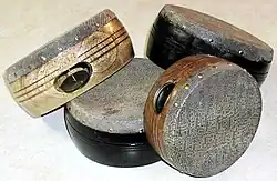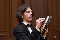 An advanced playing technique is known as the thumb or finger roll.[6][7] The middle finger or thumb is moved over the skin or rim of the tambourine, producing a fast roll from the jingles on the instrument. The thumb or middle finger of the hand not holding the tambourine is run around the head of the instrument approximately one centimeter from the rim with some pressure applied. If performed correctly, the finger should bounce along the head rapidly, producing the roll. Usually, the end of the roll is articulated using the heel of the hand or another finger. To perform this technique, the percussionist usually lightly licks the tip of their thumb or uses beeswax or rosin. These materials increase friction making it easier to execute. A continuous roll can be achieved by moving the thumb in a "figure of 8" pattern around the head.