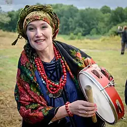 Buben (Бубен in Russian, Бубон in Ukrainian, boben in Slovenian, buben in Czech,[20] bęben in Polish) is a musical instrument of the percussion family similar to a tambourine. A buben consists of a wooden or metal hoop with a tight membrane stretched over one of its sides (some bubens have no membrane at all). Certain kinds of bubens are equipped with clanking metal rings, plates, cymbals, or little bells. It is held in the hand and can be played in numerous ways, from stroking or shaking the jingles to striking it sharply with hand. It is used for rhythmical accompaniment during dances, soloist or choral singing. Buben is often used by some folk and professional bands, as well as orchestras.