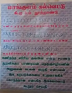 The Tamil script, like the other Brahmic scripts, is thought to have evolved from the original Brahmi script.[8] The earliest inscriptions which are accepted examples of Tamil writing date to the Ashokan period. The script used by such inscriptions is commonly known as the Tamil-Brahmi or "Tamili script" and differs in many ways from standard Ashokan Brahmi. For example, early Tamil-Brahmi, unlike Ashokan Brahmi, had a system to distinguish between pure consonants (m, in this example) and consonants with an inherent vowel (ma, in this example). In addition, according to Iravatham Mahadevan, early Tamil Brahmi used slightly different vowel markers, had extra characters to represent letters not found in Sanskrit and omitted letters for sounds not present in Tamil such as voiced consonants and aspirates.[8] Inscriptions from the 2nd century use a later form of Tamil-Brahmi, which is substantially similar to the writing system described in the Tolkāppiyam, an ancient Tamil grammar. Most notably, they used the puḷḷi to suppress the inherent vowel.[9] The Tamil letters thereafter evolved towards a more rounded form and by the 5th or 6th century, they had reached a form called the early vaṭṭeḻuttu.[10]