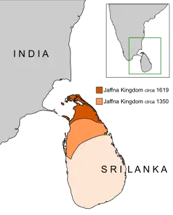The Aryachakaravarthi dynasty continued to rule over large parts of northeast Sri Lanka until arrival of the Europeans on the island in the sixteenth century CE. Portuguese traders reached Sri Lanka by 1505 CE and the Jaffna kingdom came to the attention of Portuguese due to its presence as a logistical and strategic base for accessing the interior ruled by the Kandyan kingdom.[156] King Cankili I resisted contacts with the Portuguese and repelled Parava Catholics who were brought from India to the Mannar Island to take over the lucrative pearl fisheries from the Jaffna kings.[157][158] The wrested Mannar during the first invasion in 1560 and killed king Puvirasa Pandaram during the second expedition in 1591.[159] After the conflicts, the Portuguese secured the kingdom in 1619 from the unpopular Cankili II, who was helped by the Thanjavur Nayaks.[160][161] English sailor Robert Knox arrived in the island in 1669 and described the Tamil settlements in the An Historical Relation of the Island Ceylon published in 1681.[162]