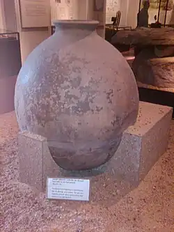 Archaeological evidence suggests the region was first inhabited by hominids over 400 millennia ago.[26][27] Artifacts recovered in Adichanallur by the Archaeological Survey of India (ASI) indicate megalithic urn burials, dating from back to 1500 BCE.[28][29][30] which are also described in early Tamil literature.[31] Excavations at Keezhadi have revealed a large urban settlement, with the earliest artefact dated to 580 BCE, during the time of urbanization in the Indo-Gangetic plain.[32] Epigraphical inscriptions found at Adichanallur and potsherds uncovered from Keezhadi use Tamil Brahmi, a rudimentary script dated to 6th century BCE.[33][34]