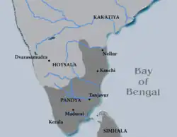 The eventual decline of Chola power began towards the end of Kulottunga III's reign in the thirteenth century CE.[71] The Pandyas again reigned supreme under Maravarman Sundara I and defeated the Cholas under Rajaraja III.[79] Though the Cholas were revived briefly with the aid of Hoysalas, civil war between Rajaraja and Rajendra III weakened them further.[80] With the Hoysalas later siding with the Pandyas, the Pandyas consolidated control over the region.[81] The Pandya empire reached its zenith in the thirteenth century CE under Jatavarman Sundara Pandyan I after he defeated the Hoysalas, the Kakatiyas and captured parts of Sri Lanka. The Pandyas ruled from their capital of Madurai and expanded trade links with other maritime empires.[82] Venetian explorer Marco Polo mentioned the Pandyas as the richest empire in existence.[83] The Pandyas also built a number of temples including the Meenakshi Amman Temple at Madurai.[84] In the fourteenth century CE, the Pandyan empire was engulfed in a civil war and also faced repeated invasions by the Delhi Sultanate.[85] In 1335, the Pandyan capital was conquered by Jalaluddin Ahsan Khan and the short-lived Madurai Sultanate was established.[86][87]