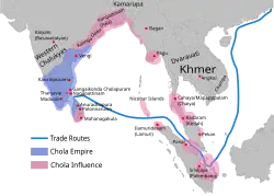 The Cholas were revived in the ninth century CE by Vijayalaya Chola and the last Pallavas ruler Aparajitavarman was defeated by the Chola prince Aditya I.[66] After the defeat of the Pallavas, the Cholas became the dominant kingdom with the capital at Thanjavur. The Chola influence expanded subsequently with Rajaraja I conquering the entire Southern India and parts of present-day Sri Lanka and Maldives, and increased Chola influence across the Indian Ocean in the eleventh century CE.[67][68] Rajaraja brought in administrative reforms including the reorganisation of Tamil country into individual administrative units.[69] Under his son Rajendra Chola I, the Chola empire reached its zenith and stretched as far as Bengal in the north and across the Indian Ocean.[70] He defeated the Eastern Chalukyas and the Chola navy invaded the Srivijaya Empire in South East Asia.[71] The Cholas had trade links with the Chinese Song Dynasty and across Southeast Asia.[72][73] The Cholas built many temples with the most notable being the Brihadisvara Temple at Thanjavur.[74] The latter half of the eleventh century saw the union of Chola and Vengi kingdoms under Kulottunga I.[75] The Cholas repulsed attacks from the Western Chalukyas and maintained its influence over the various kingdoms of Southeast Asia.[76][77] According to historian Nilakanta Sastri, Kulottunga avoided unnecessary wars and had a long and prosperous reign characterized by unparalleled success that laid the foundations of the empire for the next 150 years.[78]