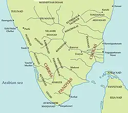 The Sangam period lasted from 3rd century BCE to 3rd century CE with the main source of history during the period coming from the various Sangam literature.[35][36] Ancient Tamilakam was ruled by a triumvirate of monarchical states, Cheras, Cholas and Pandyas.[37] These kings are referred to as Vāṉpukaḻ Mūvar (Three glorified by heaven) in the Sangam literature.[38] The Cheras controlled the western part of Tamilkam, the Pandyas controlled the south, and the Cholas had their base in the Kaveri delta.[39][40] They are mentioned in the inscriptions from the Mauryan Empire dated to third century BCE.[41] Kalinga inscriptions from the second century BCE refers to a confederacy of the Tamil kingdoms.[42] The three kings called Vendhar ruled over several hill tribes headed by the Velir chiefs and settlements headed by clan chiefs called Kizhar.[43] The rulers of smaller territories were referred to as Kurunilamannar, with Purananuru mentioning the names of many such chieftains.[44]