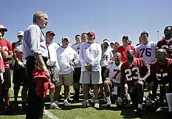 Soon after the Super Bowl victory, a growing number of press reports indicated Gruden's lack of patience with general manager McKay, a major architect of the Buccaneers' rebuilding effort over the previous ten years. McKay, like Gruden, had long-established ties to the Tampa Bay area. However, during the 2003 season, the Gruden-McKay relationship deteriorated as the Buccaneers struggled on the field. In November, Keyshawn Johnson was deactivated by the team ten games into the season for his conduct, which included sideline arguments with Buccaneers coaches and players.[76] Johnson was eventually traded to the Dallas Cowboys for wide receiver Joey Galloway, who later in his career played for the New England Patriots, Pittsburgh Steelers, and Washington Redskins.[77]