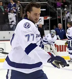 In January 2014, general manager Steve Yzerman, who also served as the general manager for Canada's team at the 2014 Winter Olympics, elected not to name Lightning captain Martin St. Louis to Canada's roster, instead choosing the still-injured Stamkos. After Stamkos was not medically cleared to play in Sochi in early February, Yzerman ultimately named St. Louis to Team Canada as an injury replacement. In late February, it was reported St. Louis had requested a trade from Yzerman the month prior.[43] St. Louis, who had a no-move clause in his contract with Tampa Bay, reportedly consented to only being traded to the New York Rangers. On March 5, 2014, St. Louis was sent to New York along with a conditional 2015 second-round pick in exchange for New York captain Ryan Callahan, a 2015 first-round draft pick, a conditional 2014 second-round pick and a 2015 conditional seventh-round pick. The deal came subsequently after Stamkos had been cleared to return to the Lightning's active roster. St. Louis cited his decision based on his family and thanked Lightning fans for their support during his tenure with the franchise, but would not specify any further about the reasons leading to his request.[44] On March 6, Steven Stamkos was named Tampa Bay's 10th captain in his first game back after recovering from a tibia injury.[45] On April 7, the team announced it had signed general manager Steve Yzerman to a four-year contract extension.[46]