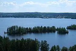 Tampere is part of the Pirkanmaa region and is surrounded by the municipalities of Kangasala, Lempäälä, Nokia, Orivesi, Pirkkala, Ruovesi and Ylöjärvi.[85] Tampere has 180 lakes larger than 10,000 m2 (110,000 sq ft), and freshwater bodies cover 24% of its area.[15] The lakes formed as separate basins from Lake Ancylus about 7500–8000 years ago.[86] Tampere's northernmost point is in the Vankavesi Fjard of Teisko, the southernmost at the eastern end of Lake Hervanta, the easternmost at the northeast corner of Lake Paalijärvi of Teisko, and the westernmost at the southeast corner of Lake Haukijärvi near the borders of Ylöjärvi and Nokia. The city centre is surrounded by three lakes, Näsijärvi, Pyhäjärvi, and the much smaller Iidesjärvi. The Tampere region lies in the basin of the Kokemäki River, which flows into the Bothnian Sea through Pori, the capital of the Satakunta region.[86] Tampere's bedrock consists of mica schist and migmatite,[87] and its building stone deposits are diverse: in addition to the traditional granite, there is an abundance of quartz diorite, tonalite, mica schist and mica gneiss.[88] One of Tampere's most striking geographic features is the Pyynikki Ridge (Pyynikinharju), a large esker formed from moraine during the Weichselian glaciation.[89] It rises 160 m (520 ft) above sea level and is said to be the largest gravel esker in the world.[89] It is also part of Salpausselkä, a 200 km (120 mi) long ridge system left over from the Ice Age.[89]