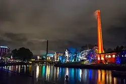 Tampere is wedged between two lakes, Lake Näsijärvi and Lake Pyhäjärvi,[15][16] with an 18 m (59 ft) difference in water level, and the rapids that connect them, Tammerkoski, have been an important source of power throughout history, most recently for generating electricity.[17] Tampere is known as the "Manchester of the North" because of its past as a centre of Finnish industry,[16][18] which has given rise to its Finnish nickname "Manse"[1] and terms such as "Manserock".[19][20][21] Tampere has also been officially declared the "Sauna Capital of the World"[16] because it has the most public saunas in the world.[12][22][23][24][25]