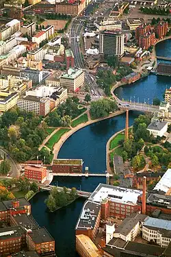 The centre of Tampere (Keskusta) and the districts of Pyynikki, Ylä-Pispala and Ala-Pispala lie on the isthmus between Lakes Pyhäjärvi and Näsijärvi. The city's location on the edge of the Tammerkoski Rapids between two long waterways was one of the main reasons for its foundation in the 1770s.[90] The streets of central Tampere form a typical grid pattern. On the western edge of the city centre is a north–south park road, Hämeenpuisto ("Häme Park" or "Tavastia Park"), which runs from the shore of Lake Pyhäjärvi near Lake Näsijärvi. The wide Hämeenkatu road runs east–west from Tampere Central Station to Hämeenpuisto and crosses Tammerkoski along the Hämeensilta bridge. Also along Hämeenkatu is the longest street in the city centre, Satakunnankatu, which runs from Rautatienkatu to Amuri and crosses Tammerkoski via the Satakunnansilta bridge. Tampere's central square is located on the western bank of Tammerkoski, near Hämeensilta. The traffic centre of Tampere is the junction of Itsenäisyydenkatu,[e] Teiskontie, Sammonkatu, Kalevanpuisto park road and the Kaleva and Liisankallio districts.[91]