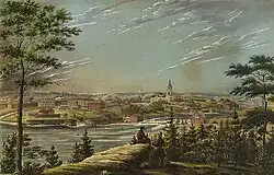 The earliest known permanent settlements around Tammerkoski were established in the 7th century, when settlers from the west of the region began to farm land in Takahuhti,[52] an area largely inhabited by the Tavastian tribes.[53] The population remained small for many centuries. By the 16th century, the villages of Messukylä and Takahuhti had become the area's largest settlements. Other nearby villages were Laiskola, Pyynikkälä and Hatanpää. There had been a marketplace in the Pispala area for centuries, where the bourgeoisie from Turku in particular traded.[54] In 1638, Governor-General Per Brahe the Younger ordered that two markets be held in Tammerkoski every year, the autumn market on St Peter's Day in August and the winter one on Matias's Day in February. In 1708 the market was moved from the outskirts of Tammerkoski to Harju, and in 1758 from there to Pispala.[55]: 16 The first industries in the Pirkanmaa region in the 17th century were mainly watermills and sawmills. In the 18th century other industries began to develop, as several small ironworks, the Tammerkoski distillery, and the Otavala spinning school were established.[56]