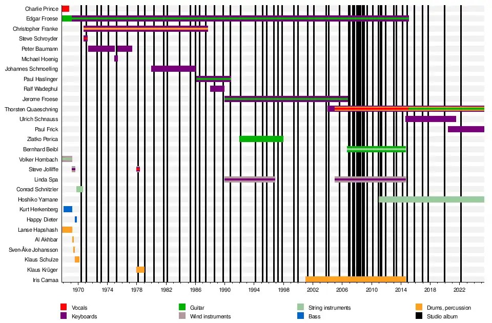 | Past members | Edgar Froese Lanse Hapshash Kurt Herkenberg Volker Hombach Charlie Prince Steve Jolliffe Klaus Schulze Conrad Schnitzler Christopher Franke Steve Schroyder Peter Baumann Michael Hoenig Klaus Krüger Johannes Schmoelling Paul Haslinger Ralf Wadephul Jerome Froese Linda Spa Zlatko Perica Iris Camaa Bernhard Beibl Ulrich Schnauss |