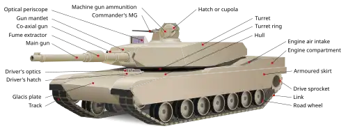 A tank is an armoured fighting vehicle intended as a primary offensive weapon in front-line ground combat. Tank designs are a balance of heavy firepower, strong armour, and battlefield mobility provided by tracks and a powerful engine; their main armament is often mounted within a turret. They are a mainstay of modern 20th and 21st century ground forces and a key part of combined arms combat.