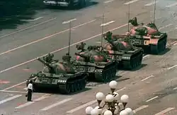 ![]() "Tank Man" temporarily stops the advance of four Type 59 tanks on June 5, 1989, in Beijing. This photograph (one of six similar versions) was taken by Jeff Widener of the Associated Press. | |||||||