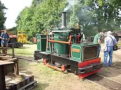 The contractor's locomotive was a small tank locomotive specially adapted for use by civil engineering contractor firms engaged in the building of railways. The locomotives would be used for hauling men, equipment and building materials over temporary railway networks built at the worksite that were frequently re-laid or taken up and moved elsewhere as building work progressed. Contractor's locomotives were usually saddle or well tank types (see above) but required several adaptations to make them suitable for their task. They were built to be as light as possible so they could run over the lightly built temporary rails and had deeply flanged wheels so they did not de-rail on the tracks which were often very uneven.[6]