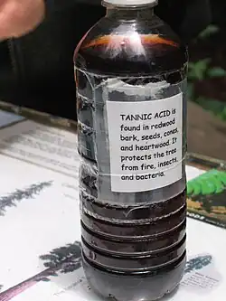 The tannin compounds are widely distributed in many species of plants, where they play a role in protection from predation (acting as pesticides) and might help in regulating plant growth.[1] The astringency from the tannins is what causes the dry and puckery feeling in the mouth following the consumption of unripened fruit, red wine or tea.[2] Likewise, the destruction or modification of tannins with time plays an important role when determining harvesting times.
