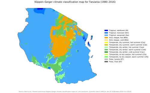 Climate change in Tanzania is resulting in rising temperatures with a higher likelihood of intense rainfall events (resulting in flooding) and of dry spells (resulting in droughts).[84][85] Climate change is already impacting the sectors in Tanzania of agriculture, water resources, health and energy. Sea level rise and changes in the quality of water are expected to impact fisheries and aquaculture.[86]