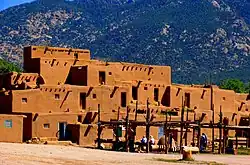 ![]() Multifamily dwelling in Taos Pueblo in 2017 The snow-capped peak of Maxwaluna, especially sacred to the Taos Pueblo people, sits in the background | |