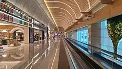 Taiwan Taoyuan International Airport currently has two terminals, which are connected by two short people movers.[21] The third terminal is under construction, while the fourth terminal is planned, however plans may be halted. The Taoyuan Airport MRT links the terminals together underground, and provides transportation to Taipei City.[22][23]