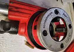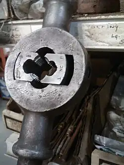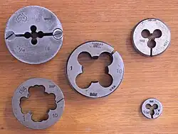 Rethreading dies, also known as Die nuts, are dies made for cleaning up damaged threads, which is referred to as "chasing."[17] These dies have no split for resizing, minimal "gullet" and are made from a hexagonal bar sized so that the wrench used for a standard nut of that size may be used to turn them. Rethreading dies cannot be used to cut new threads as they lack chip forming teeth. Note, however the external profile of a die does not strictly map to its function. Manufacturers of dies have produced models in a hex form which are intended for the creation of new threads.[18] These appear identical to solid dies in all aspects besides the external shape. Hexagonal thread cutting dies are used with a die stock with hexagonal holding features.