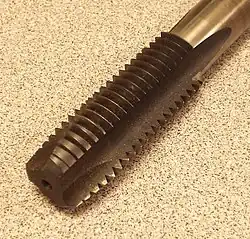 The small tap illustrated at the bottom of the image is similar to an intermediate tap but has a more pronounced taper to the cutting edges. This feature gives the taper tap a very gradual cutting action that is less aggressive than that of the plug tap. The number of tapered threads typically ranges from 8 to 10.[6] A taper tap is most often used when the material is difficult to work (e.g., alloy steel) or the tap is of a very small diameter and thus prone to breakage.