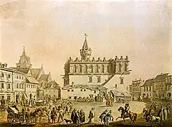 Tarnów remained in the hands of the Leliwa family, out of which in the 15th century the Tarnowski family emerged. In the 14th century, numerous German settlers immigrated from Kraków and Nowy Sącz (see Walddeutsche, Ostsiedlung). During the 17th century Scottish immigrants began to come in large numbers. In 1528 the exiled King of Hungary János Szapolyai lived in the town.[10] The town prospered during the Polish Golden Age, when it belonged to Hetman Jan Tarnowski (1488–1561). In the mid-16th century, its population was app. 1,200, with 200 houses located within town's defensive wall (the wall itself had been built in the mid-15th century, and expanded in the early 16th century). In 1467, the waterworks and sewage systems were completed, with large cisterns filled with drinking water built in the main market square. In the 16th century, during the period known as the Polish Golden Age, Tarnów had a school, a synagogue, a Calvinist prayer house, Roman Catholic churches, and up to twelve guilds.