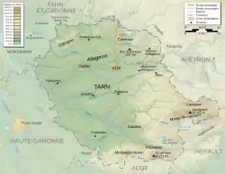 Tarn (French: [taʁ(n)], Occitan: [taɾ]) is a department in the Occitania region in Southern France. Named after the river Tarn, it had a population of 389844 as of 2019.[4] Its prefecture and largest city is Albi; it has a single subprefecture, Castres. In French, the inhabitants of Tarn are known as Tarnais (masculine) and Tarnaises (feminine).[5] Its INSEE and postcode number is 81.