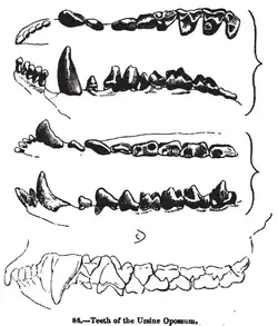 Fossil deposits in limestone caves at Naracoorte, South Australia, dating to the Miocene include specimens of S. laniarius, which were around 15% larger and 50% heavier than modern devils.[16] Older specimens believed to be 50–70,000 years old were found in Darling Downs in Queensland and in Western Australia.[17] It is not clear whether the modern devil evolved from S. laniarius, or whether they coexisted at the time.[17] Richard Owen argued for the latter hypothesis in the 19th century, based on fossils found in 1877 in New South Wales.[17] Large bones attributed to S. moornaensis have been found in New South Wales,[17] and it has been conjectured that these two extinct larger species may have hunted and scavenged.[17] It is known that there were several genera of thylacine millions of years ago, and that they ranged in size, the smaller being more reliant on foraging.[18] As the devil and thylacine are similar, the extinction of the co-existing thylacine genera has been cited as evidence for an analogous history for the devils.[19] It has been speculated that the smaller size of S. laniarius and S. moornaensis allowed them to adapt to the changing conditions more effectively and survive longer than the corresponding thylacines.[19] As the extinction of these two species came at a similar time to human habitation of Australia, hunting by humans and land clearance have been mooted as possible causes.[20] Critics of this theory point out that as indigenous Australians only developed boomerangs and spears for hunting around 10,000 years ago, a critical fall in numbers due to systematic hunting is unlikely. They also point out that caves inhabited by Aborigines have a low proportion of bones and rock paintings of devils, and suggest that this is an indication that it was not a large part of indigenous lifestyle. A scientific report in 1910 claimed that Aborigines preferred the meat of herbivores rather than carnivores.[21] The other main theory for the extinction was that it was due to the climate change brought on by the most recent ice age.[20]