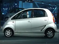 The Tata Nano is a city car/microcar manufactured and marketed by Indian automaker Tata Motors over a single generation from 2008 to 2018. It was primarily sold in India as an inexpensive economy car for motorcycle and scooter drivers — with a launch price of ₹100,000 (US$2,500) on 10 January 2008.[5] The Nano has a rear-engine, rear-wheel-drive layout and was initially produced as a four-door saloon car with no rear cargo opening, with a five-door hatchback version introduced in 2015.