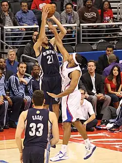 On January 30, 2013, Prince and Austin Daye were traded to the Memphis Grizzlies in a three-team trade that sent Rudy Gay and Hamed Haddadi to the Toronto Raptors and José Calderón to the Pistons. The Grizzlies also received Ed Davis.[24] Though Rudy Gay had been the longtime starting small forward in Memphis, Prince appeared to be a better fit with the team, as his style of play complemented the team's "Grit-N-Grind" mantra.[25][26] The Grizzlies finished with their best record in franchise history at 56–26, and their first-ever appearance in the Western Conference Finals.