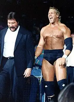 In August 1985, DiBiase formed a tag team with fellow gaijin Stan Hansen, and the two became the PWF Tag Team Champions when Hansen chose DiBiase to replace Bruiser Brody, who left for New Japan Pro-Wrestling (NJPW).[18] Later that year, DiBiase and Hansen entered the 1985 World's Strongest Tag Determination League and would emerge victorious, finishing in first place with 7 points.[19]