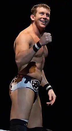 In July 2007, DiBiase signed a developmental deal with World Wrestling Entertainment (WWE) and debuted in their training territory Florida Championship Wrestling (FCW).[1][11] He made his FCW debut on August 4 in a tag team match, in which he and Jake Hager defeated Keith Walker and Heath Miller.[12] In October, DiBiase became a member of the Next Generation Hart Foundation faction alongside Harry Smith, TJ Wilson, Nattie Neidhart, and Teddy Hart.[1][11] He quickly separated from the group, however, and gained Maryse as a valet.[13][14] On December 18, 2007, DiBiase defeated TJ Wilson to win the FCW Southern Heavyweight Championship in New Port Richey, Florida.[11][15] DiBiase, however, was unable to defend it due to an injury sustained, so he awarded the championship to his partner Heath Miller on January 19, 2008.[15] As of March 2008, DiBiase had suffered from a multitude of injuries including sciatica, a fractured left knee, separated ribs, broken finger, and bone spurs in his elbow.[16] Due to these injuries, DiBiase competed sporadically in FCW for the next few months, competing in both tag team and singles competition.[17][18]