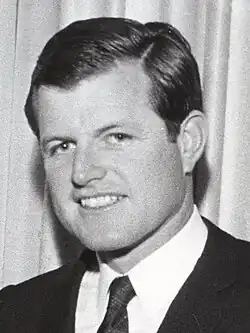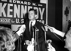 In the 1962 U.S. Senate special election in Massachusetts, Kennedy initially faced a Democratic Party primary challenge from Edward J. McCormack Jr., the state Attorney General. Kennedy's slogan was "He can do more for Massachusetts", the same one his brother John had used in his first campaign for the seat ten years earlier.[52] McCormack had the support of many liberals and intellectuals, who thought Kennedy inexperienced and knew of his suspension from Harvard, a fact which became public during the race.[45] Kennedy also faced the notion that with one brother President and another U.S. Attorney General, "Don't you think that Teddy is one Kennedy too many?" But Kennedy proved to be an effective street-level campaigner.[18] His charm was such that one delegate at the party convention said "He's completely unqualified and inexperienced. And I'm going to be with him".[16] In a televised debate, McCormack said "The office of United States Senator should be merited, and not inherited", and said that if his opponent's name was Edward Moore, not Edward Moore Kennedy, his candidacy "would be a joke".[45] Voters thought McCormack was overbearing—a Kennedy supporter said "McCormack was able to make a millionaire an underdog"[16]—and with the family political machine's finally getting fully behind him, Kennedy won the September 1962 primary by a two-to-one margin. In the November special election, Kennedy defeated Republican George Cabot Lodge II, product of another noted Massachusetts political family, gaining 55 percent of the vote.[18][53]