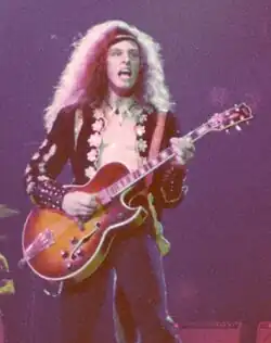 Nugent is known for his use of the Gibson Byrdland, his bluesy and frenzied guitar playing, and his energetic live shows.[1][2] Despite possessing a distinctive, wide-ranging singing voice, Nugent recorded and toured with other lead singers during much of his early solo career, including Derek St. Holmes, Charlie Huhn, Brian Howe and Meat Loaf, only taking on full lead vocal duties later on.[3] His biggest hit was 1977's "Cat Scratch Fever", on which he sang the lead vocals. In the late 1980s and early 1990s, he was part of the supergroup Damn Yankees.