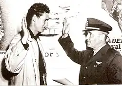 Williams joined the Navy Reserve on May 22, 1942, went on active duty in 1943, and was commissioned a second lieutenant in the United States Marine Corps as a naval aviator on May 2, 1944. Williams also played on the baseball team in Chapel Hill, North Carolina, along with his Red Sox teammate Johnny Pesky in pre-flight training, after eight weeks in Amherst, Massachusetts, and the Civilian Pilot Training Course.[69] While on the baseball team, Williams was sent back to Fenway Park on July 12, 1943, to play on an All-Star team managed by Babe Ruth. The newspapers reported that Ruth said when finally meeting Williams, "Hiya, kid. You remind me a lot of myself. I love to hit. You're one of the most natural ballplayers I've ever seen. And if my record is broken, I hope you're the one to do it".[70] Williams later said he was "flabbergasted" by the incident, as "after all, it was Babe Ruth".[70] In the game, Williams hit a 425-foot home run to help give the American League All-Stars a 9–8 win.[71]