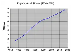 Tehran had a population of 7,711,230 people, in 2,286,787 households at the time of the 2006 National Census.[57] The 2011 census counted 8,154,051 people, in 2,624,511 households.[58] The 2016 census recorded 8,693,706 people, in 2,911,065 households.[3]