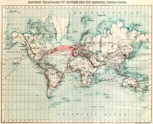 An overland telegraph from Britain to India was first connected in 1866 but was unreliable, prompting a submarine telegraph cable to be connected in 1870.[49] Several telegraph companies were combined to form the Eastern Telegraph Company in 1872. Australia was first linked to the rest of the world in October 1872 by a submarine telegraph cable at Darwin.[50]