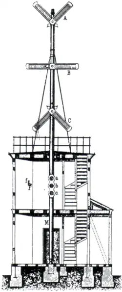 An optical telegraph is a telegraph consisting of a line of stations in towers or natural high points which signal to each other by means of shutters or paddles. Signalling by means of indicator pointers was called semaphore. Early proposals for an optical telegraph system were made to the Royal Society by Robert Hooke in 1684[12] and were first implemented on an experimental level by Sir Richard Lovell Edgeworth in 1767.[13] The first successful optical telegraph network was invented by Claude Chappe and operated in France from 1793.[14] The two most extensive systems were Chappe's in France, with branches into neighbouring countries, and the system of Abraham Niclas Edelcrantz in Sweden.[11]: ix–x, 47