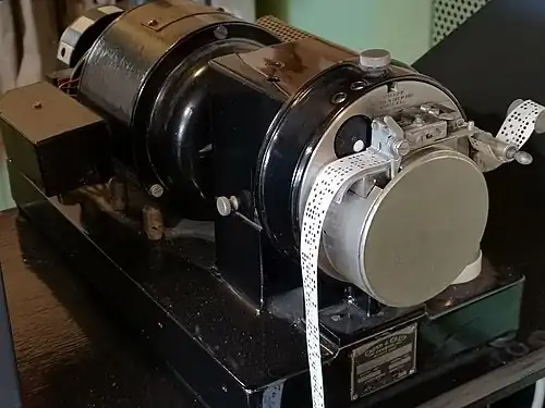 A teleprinter is a telegraph machine that can send messages from a typewriter-like keyboard and print incoming messages in readable text with no need for the operators to be trained in the telegraph code used on the line. It developed from various earlier printing telegraphs and resulted in improved transmission speeds.[37] The Morse telegraph (1837) was originally conceived as a system marking indentations on paper tape. A chemical telegraph making blue marks improved the speed of recording (Bain, 1846), but was delayed by a patent challenge from Morse. The first true printing telegraph (that is printing in plain text) used a spinning wheel of types in the manner of a daisy wheel printer (House, 1846, improved by Hughes, 1855). The system was adopted by Western Union.[38]