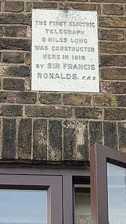 The early ideas for an electric telegraph included in 1753 using electrostatic deflections of pith balls,[17] proposals for electrochemical bubbles in acid by Campillo in 1804 and von Sömmering in 1809.[18][19] The first experimental system over a substantial distance was by Ronalds in 1816 using an electrostatic generator. Ronalds offered his invention to the British Admiralty, but it was rejected as unnecessary,[20] the existing optical telegraph connecting the Admiralty in London to their main fleet base in Portsmouth being deemed adequate for their purposes. As late as 1844, after the electrical telegraph had come into use, the Admiralty's optical telegraph was still used, although it was accepted that poor weather ruled it out on many days of the year.[21]: 16, 37 France had an extensive optical telegraph system dating from Napoleonic times and was even slower to take up electrical systems.[22]: 217–218
