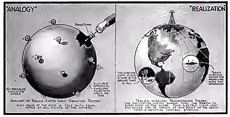 In the 1890s inventor Nikola Tesla worked on an air and ground conduction wireless electric power transmission system, similar to Loomis',[70][71][72] which he planned to include wireless telegraphy. Tesla's experiments had led him to incorrectly conclude that he could use the entire globe of the Earth to conduct electrical energy[73][69] and his 1901 large scale application of his ideas, a high-voltage wireless power station, now called Wardenclyffe Tower, lost funding and was abandoned after a few years.
