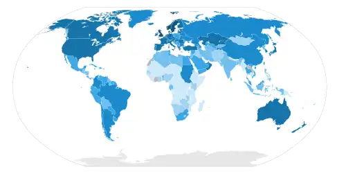 In 2013, 79% of the world's households owned a television set.[2] The replacement of earlier cathode-ray tube (CRT) screen displays with compact, energy-efficient, flat-panel alternative technologies such as LCDs (both fluorescent-backlit and LED), OLED displays, and plasma displays was a hardware revolution that began with computer monitors in the late 1990s. Most television sets sold in the 2000s were still CRT, and it was only in early 2010s that flat-screen TVs decisively overtook CRT.[3] Major manufacturers announced the discontinuation of CRT, Digital Light Processing (DLP), plasma, and even fluorescent-backlit LCDs by the mid-2010s.[4][5] LEDs are being gradually replaced by OLEDs.[6] Also, major manufacturers have started increasingly producing smart TVs in the mid-2010s.[7][8][9] Smart TVs with integrated Internet and Web 2.0 functions became the dominant form of television by the late 2010s.[10]