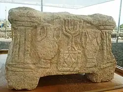 The menorah was a distinctive symbol of Samaritan identity during the Byzantine and Islamic periods.[65] Artistic depictions of the menorah have been uncovered at sites of ancient Samaritan synagogues, including El-Khirbe, Tzur Natan, and Sha'alvim.[66] Repurposed stone menorah reliefs, some with accompanying plant decorations, have been found in contemporary structures in several villages of ancient Samaria, including Qariyet Hajjah, Kafr Abbush, Kafr Zibad, Kafr Qaddum and Kafr Jit.[65]