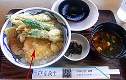 Tempura is also used in combination with other foods. When served over soba (buckwheat noodles), it is called tempura soba[18] or tensoba. Tempura is also served as a donburi dish where tempura shrimp and vegetables are served over steamed rice in a bowl (tendon) and on top of udon soup (tempura udon).